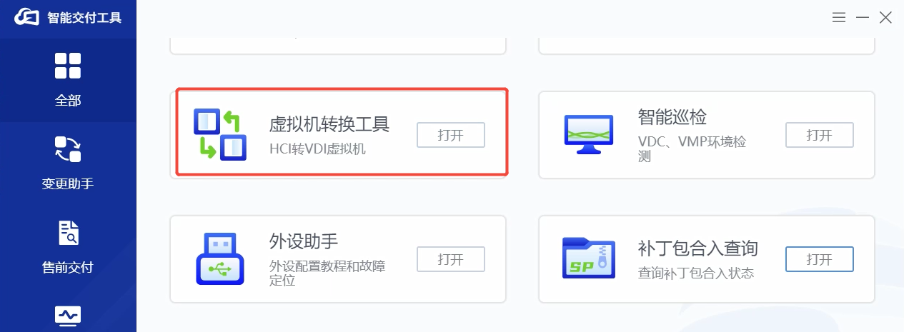 该工具内置在aDesk_Tools中,可以将HCI虚拟机转换为VDI虚拟机,也可将虚拟机模板与普通虚拟机进行链接关联,通常用于友商替换时,将友商虚拟机模板和派生虚拟机迁移到HCI后(如思杰、华为等),把友商虚拟机模板通过工具转换成VDI模板,再使用工具把其他派生的虚拟机与VDI模板关联起来,从而变成深信服的桌面云虚拟机。