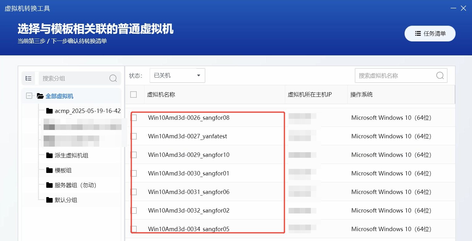 4、再选择需要把哪些虚拟机和VDI模板关联起来(相当于把派生虚拟机和模板之间的关联关系,按照深信服的逻辑重新关联起来,这样符合深信服桌面云虚拟机的功能规范):