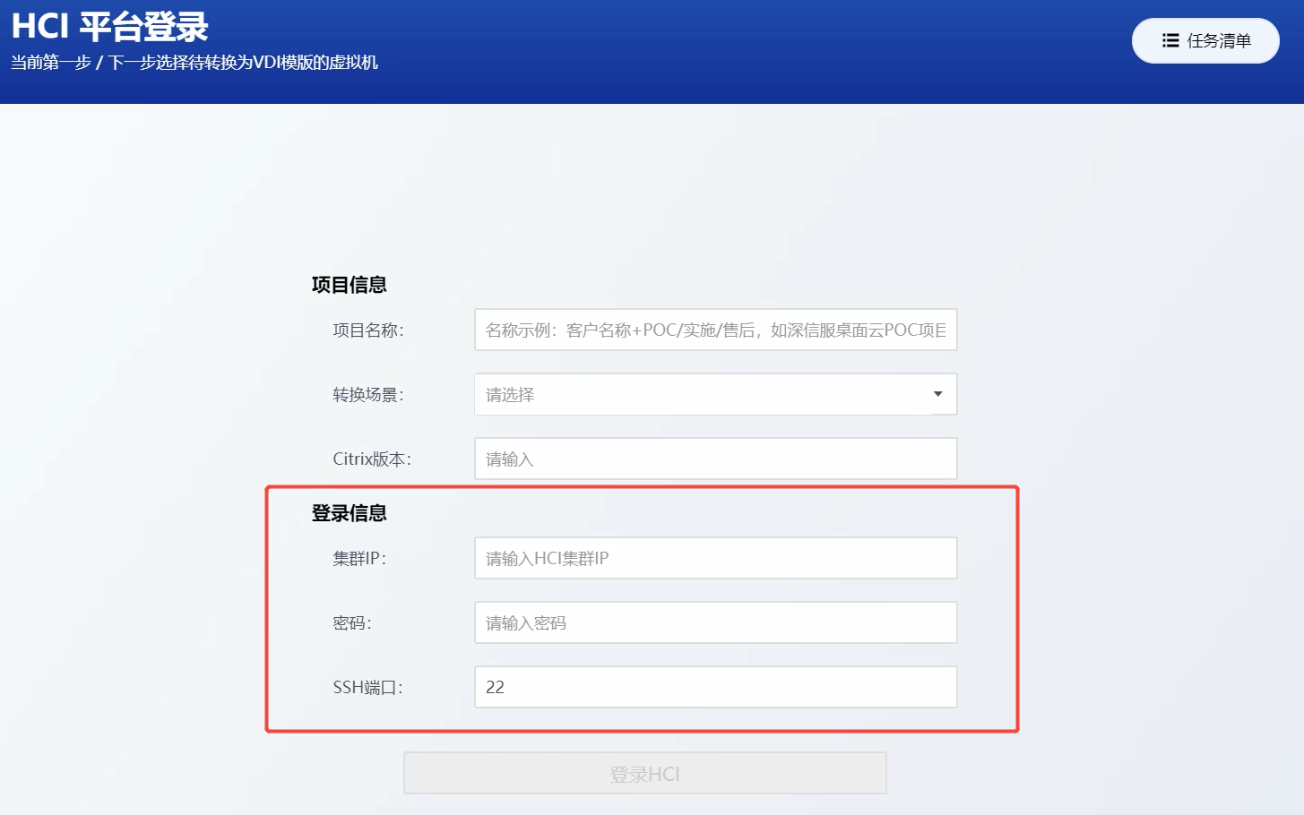 2、填写HCI平台的集群信息即可,连接HCI平台(注意需要先将友商的虚拟机迁移到HCI):
