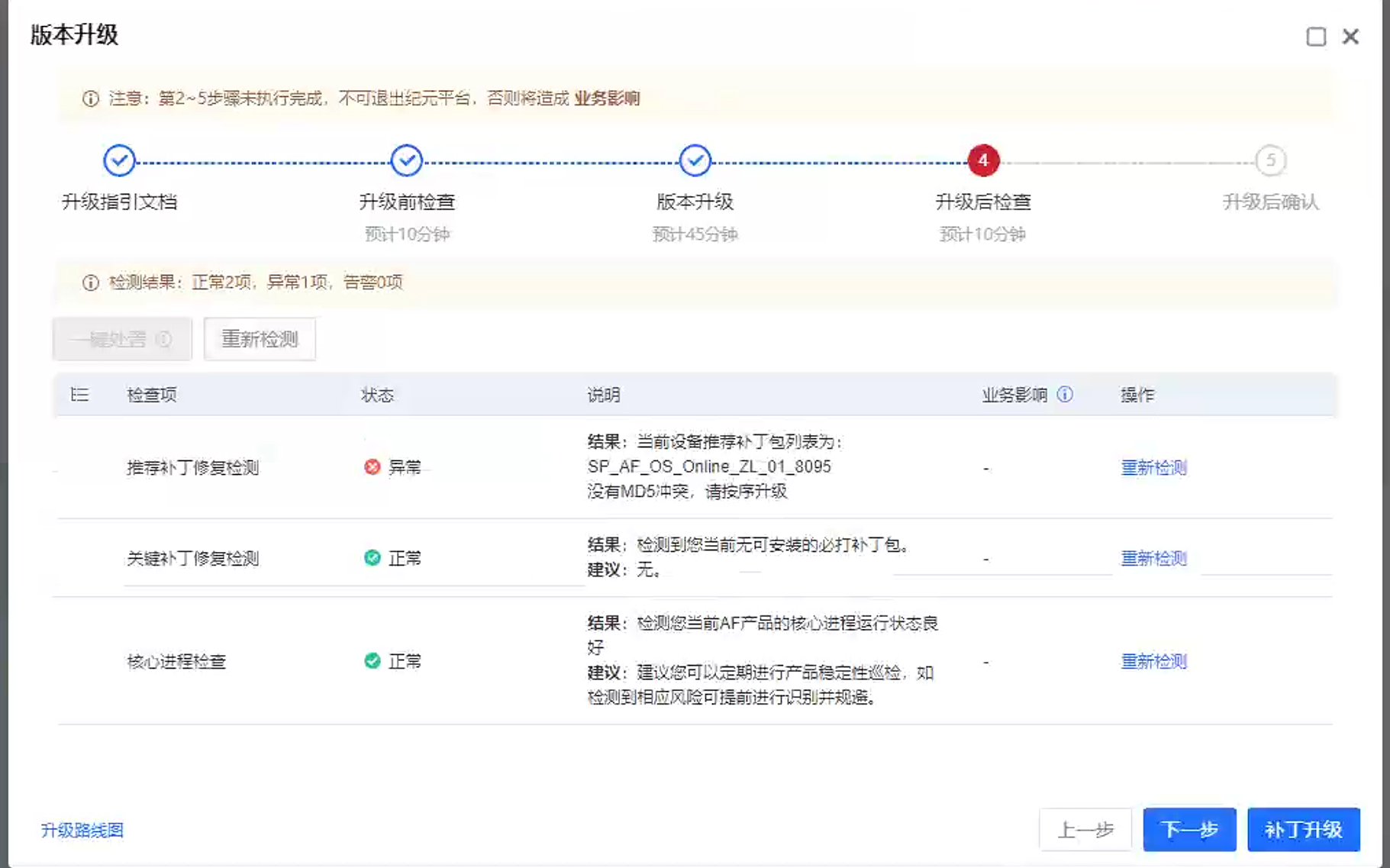 注意,若检测到有补丁需要修复,请完成补丁的升级