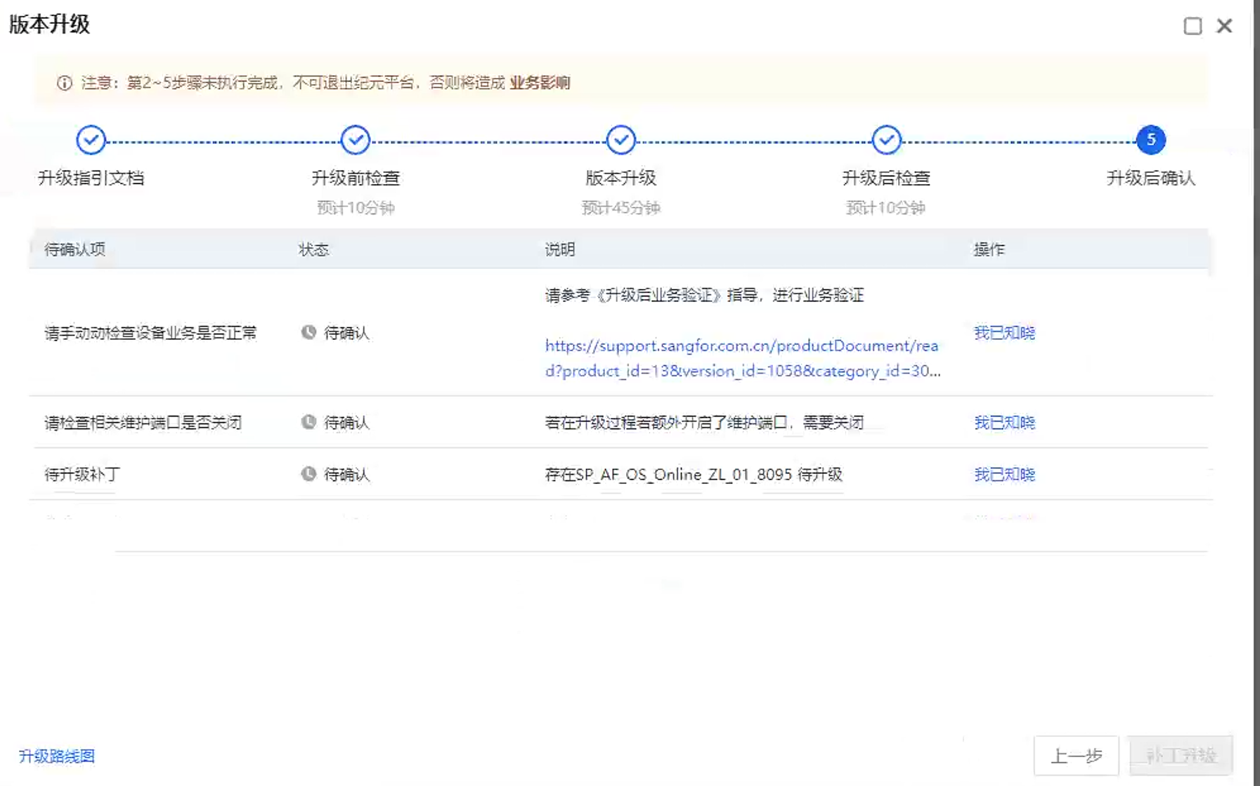 5.升级后检查通过后,按照待确认项提示完成升级扫尾工作,确认一次上门解决所有问题。