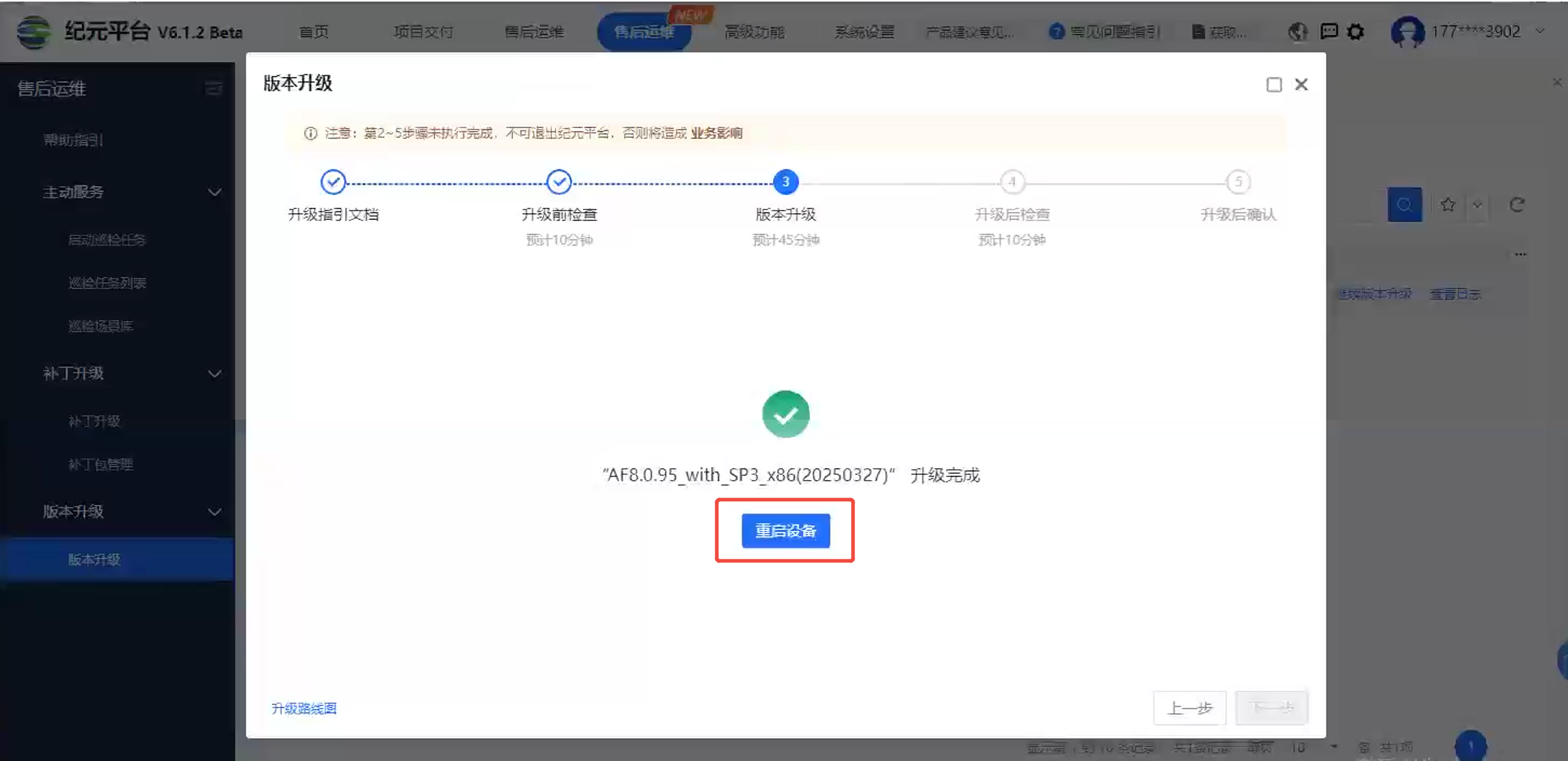 2.版本升级完成后,点击”重启设备“,待AF设备服务均起来后,纪元将自动重新连接AF设备。