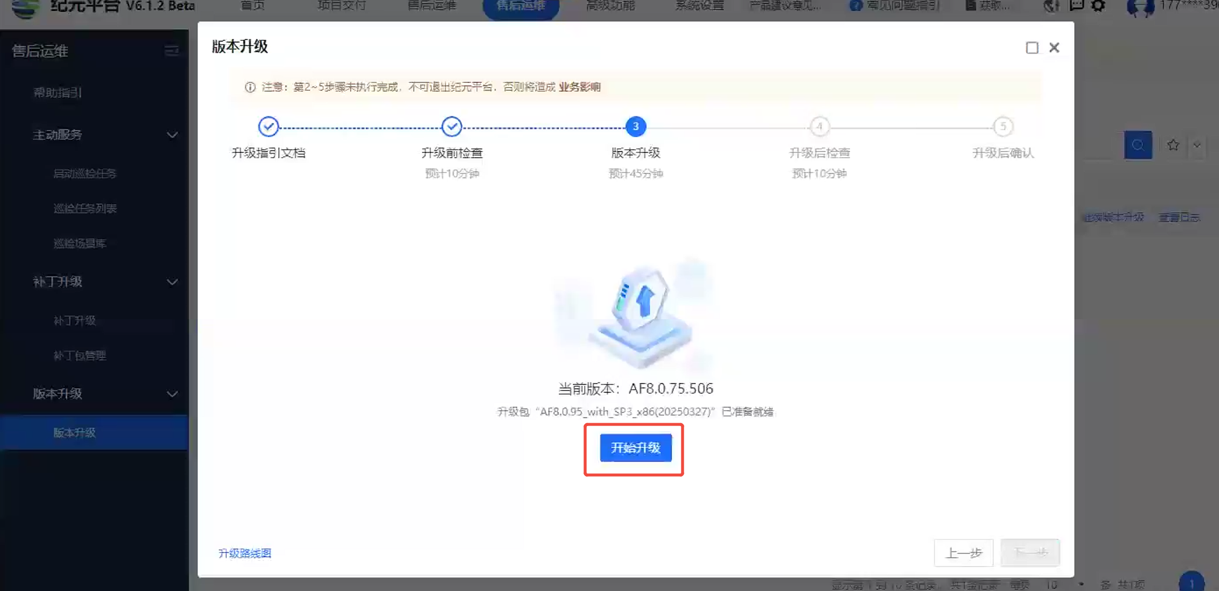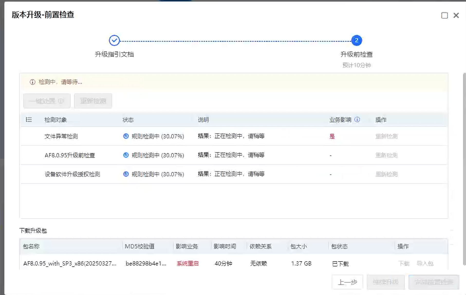 1. 巡检完成后点击【去前置检查】,即可跳转到版本升级前置检查界面