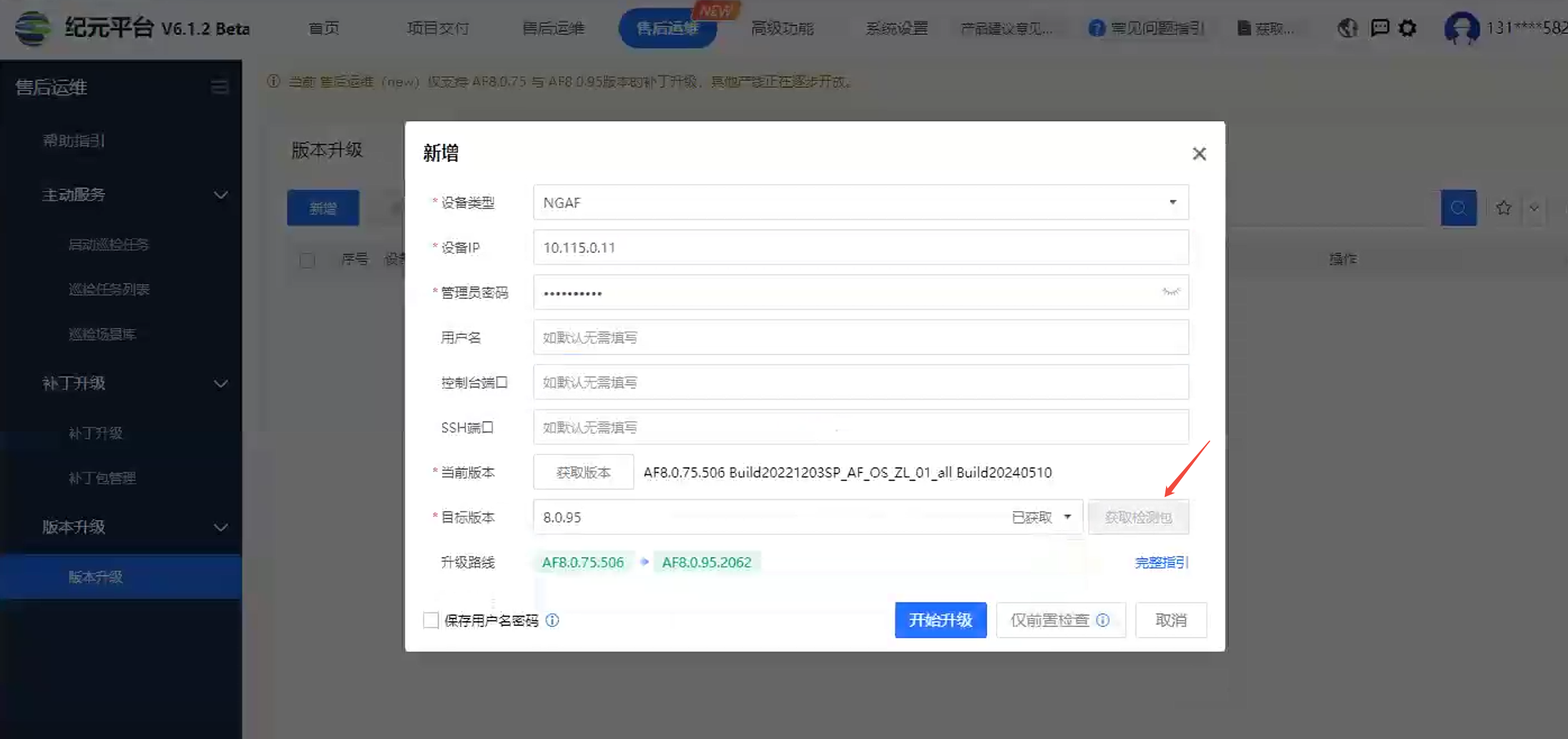1. 若是通过巡检过来,会自动填充设备相关信息,也可以直接通过导航栏方式来到【版本升级】界面,点击“获取检测包”;