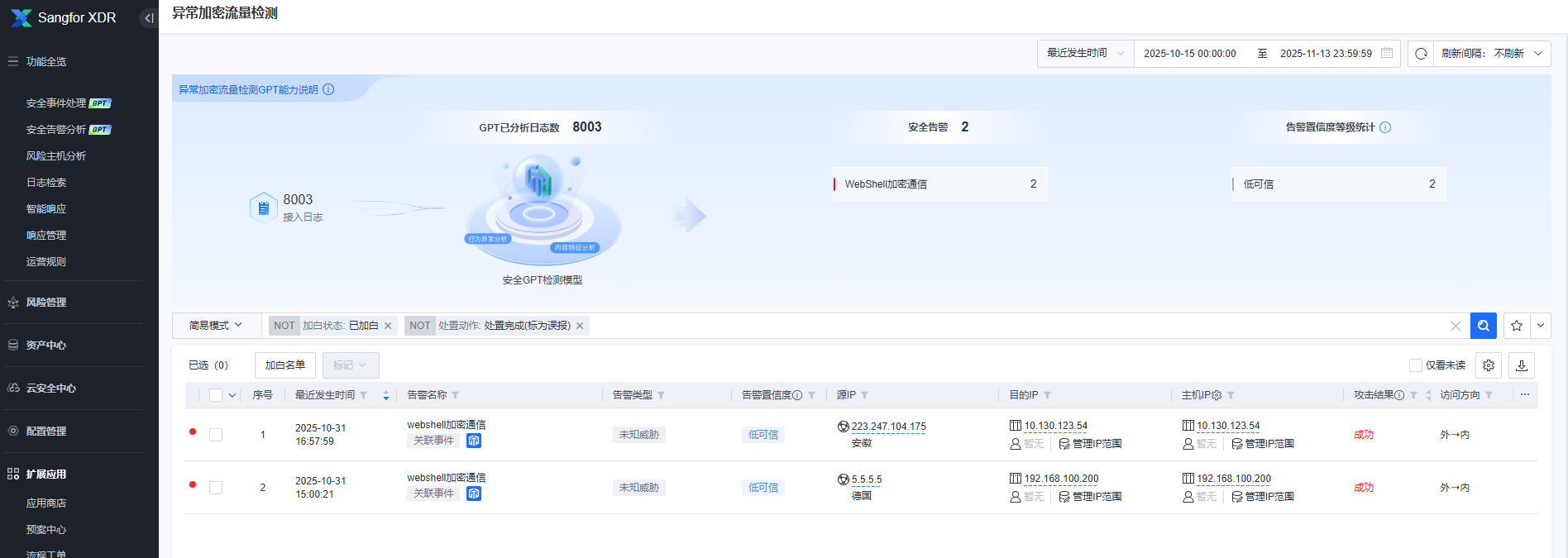 随着加密流量与伪装技术普及,传统规则/特征匹配已难以发现隐蔽 Webshell 通信。安全GPT 通过大模型将行为异常与流量内容异常双引擎深度融合,精准捕获自定义加密、业务伪装中的攻击流量,显著提升检出率并降低误报。