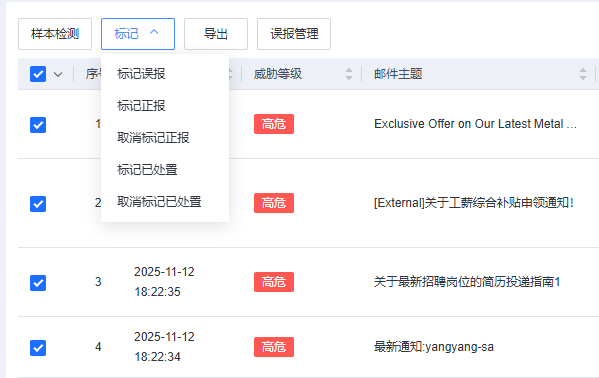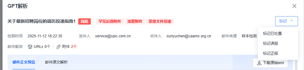 3、若管理员需要进行人工研判,在研判后可以点击<标记>按钮将邮件进行正报、误报、已处置的标记,以便于对告警事件的运营。