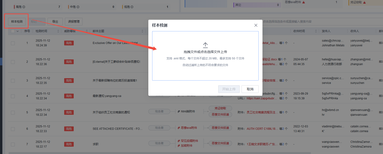 5、若需要导入钓鱼邮件样本,也可通过点击<样本检测>按钮上传钓鱼邮件样本到GPT上进行检测。
