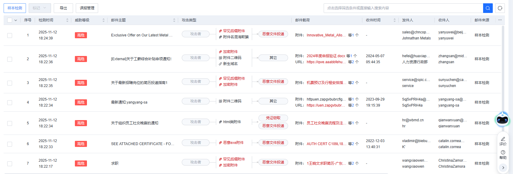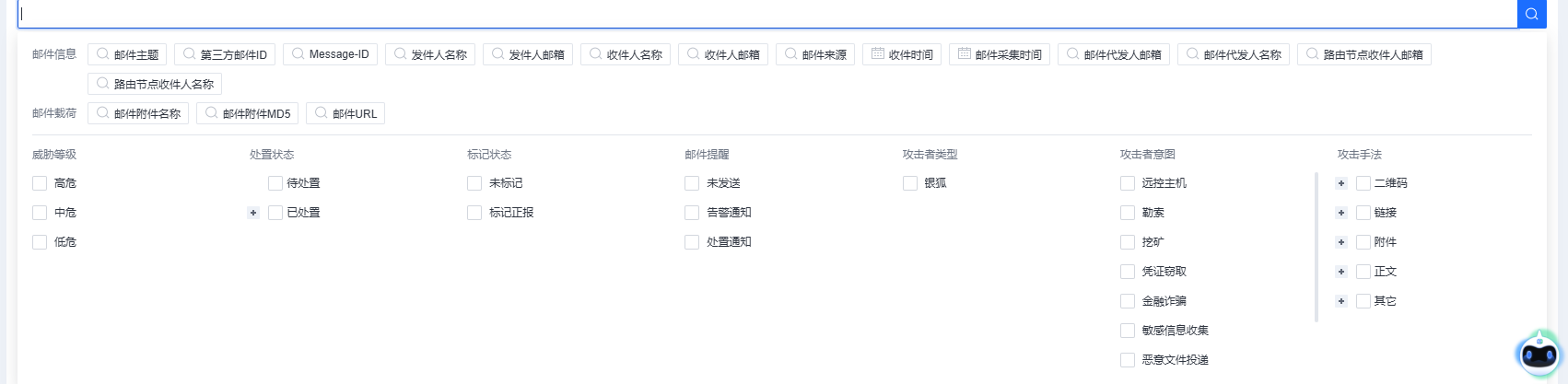 点击右上角搜索框,可以基于威胁等级、处置状态、邮件主题、发件人邮箱、收件人邮箱等维度进行告警检索。