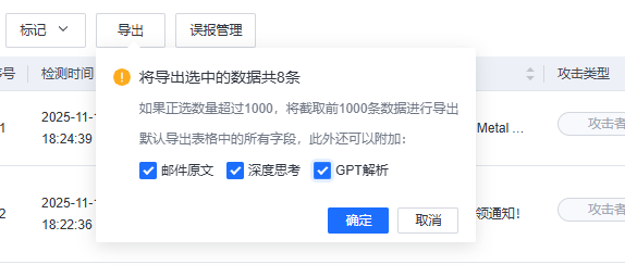 6、点击<导出>按钮可以对当前全部告警或自定义勾选的告警日志进行导出,可自定义是否导出邮件原文、深度思考、GPT解析内容。