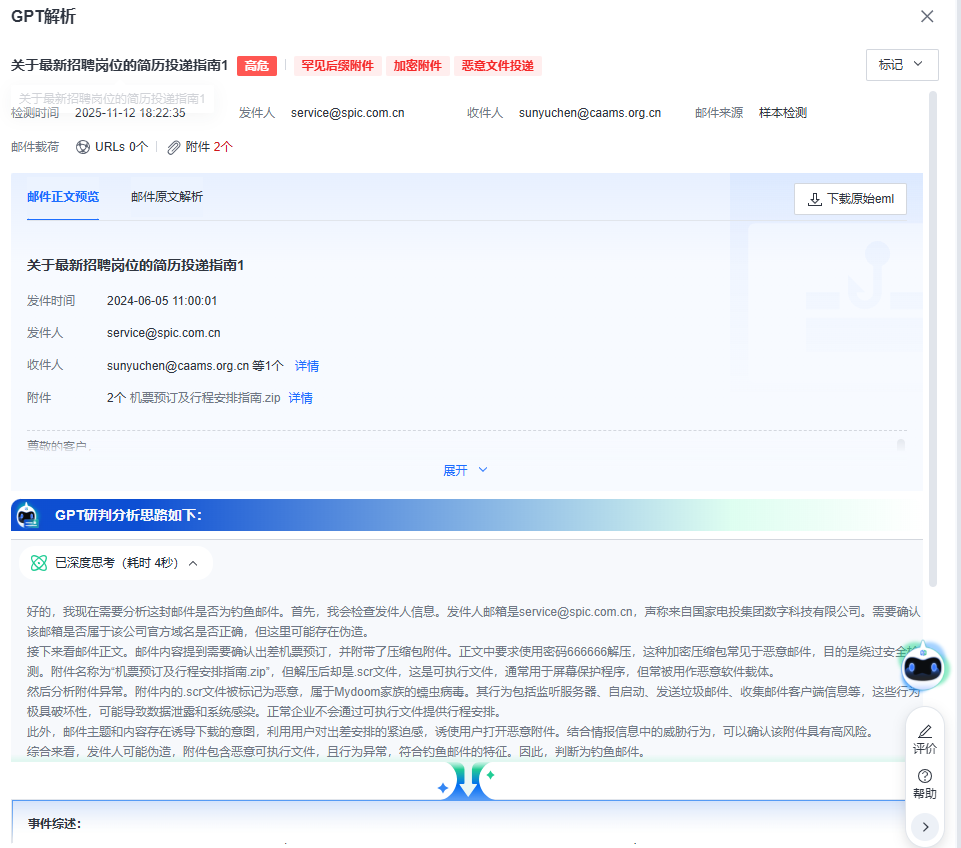 2、点击任一告警进去可以查看邮件正文内容、GPT思考过程以及研判过程。