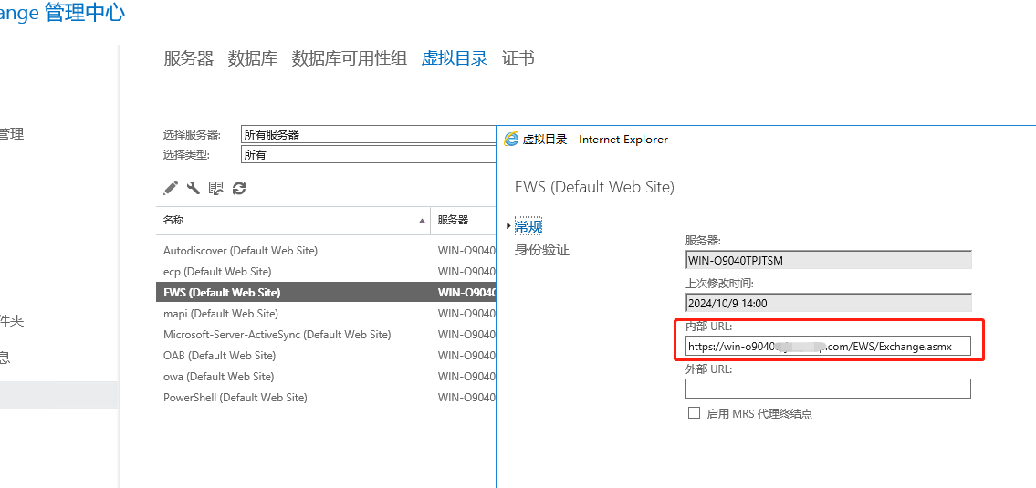 6、在Exchange管理界面,选择[服务器/虚拟目录/EWS],打开获取EWS内部URL。