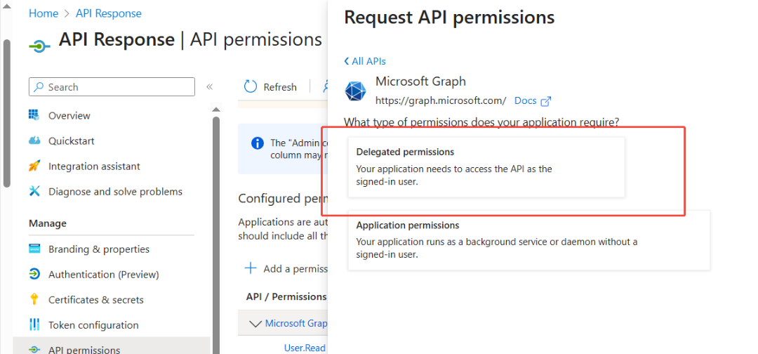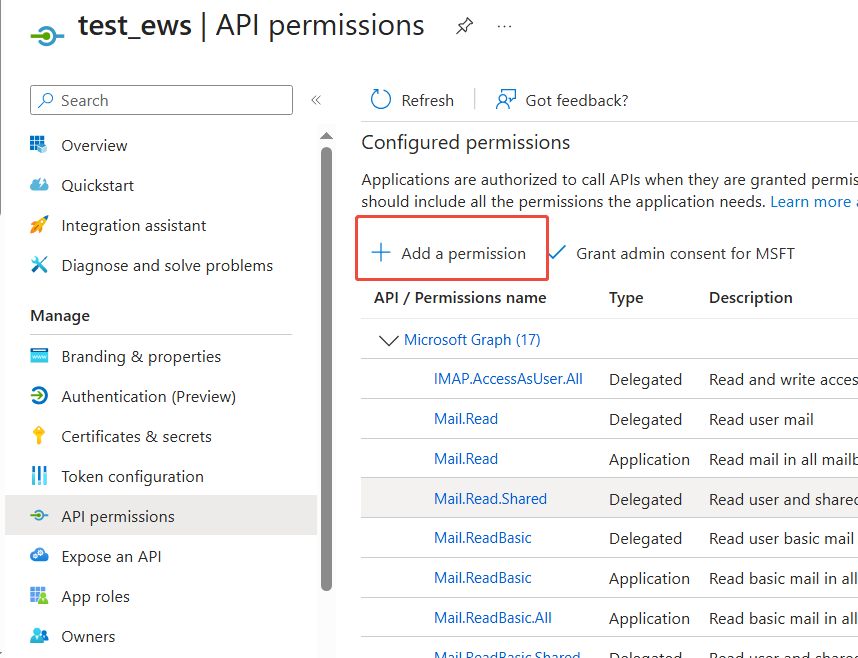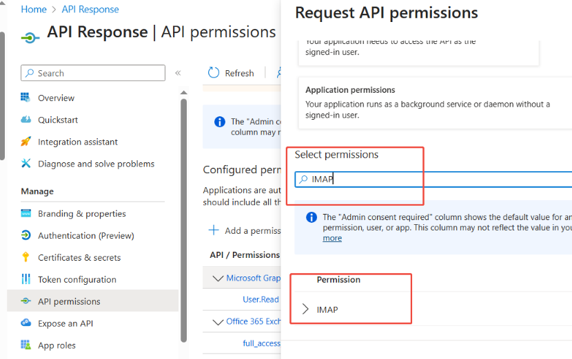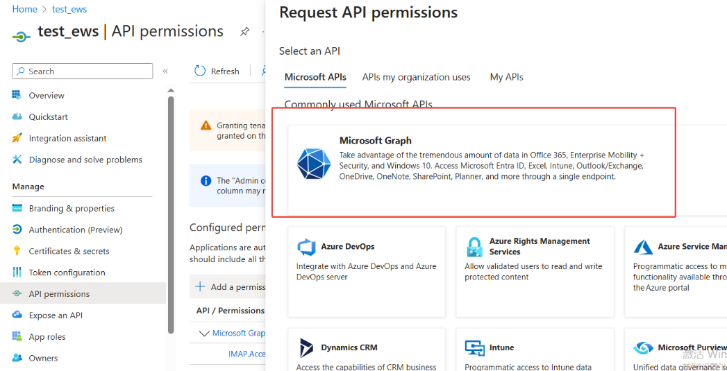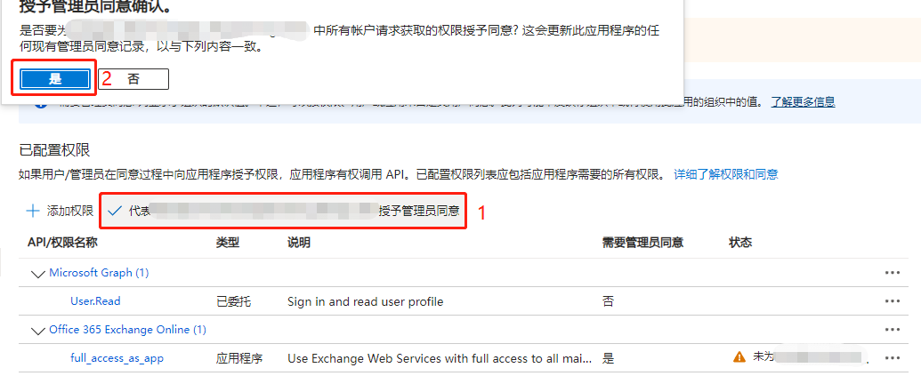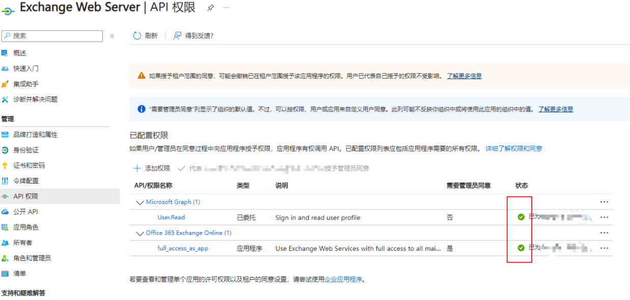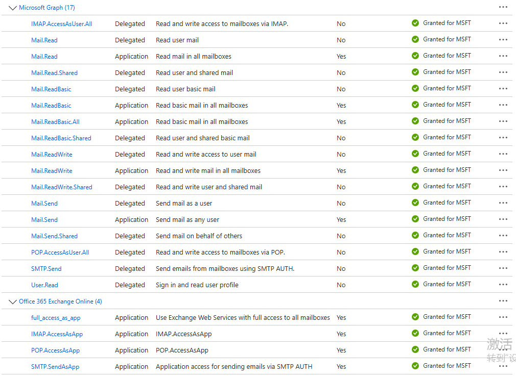 6、在应用中进入[API权限]页面,在API权限名称中可以看到Office 365 Exchange Online 和Microsoft Graph名称(部分环境可能缺失Microsoft Graph权限),把下图中的权限全都加上。