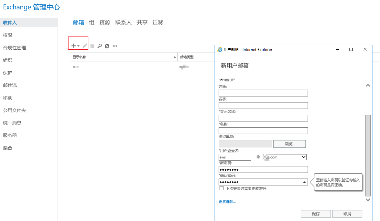 1、 使用管理员账号登录exchange 管理中心,在[收件人]处点击<+>进行账号添加。