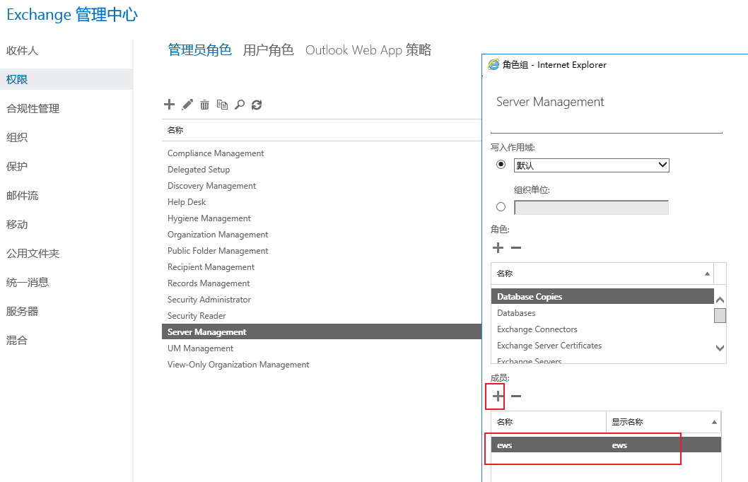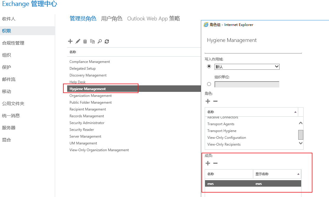2、 进入[权限]页面,将新建的账号添加到Server Management、Hygiene Management 两个角色组。
