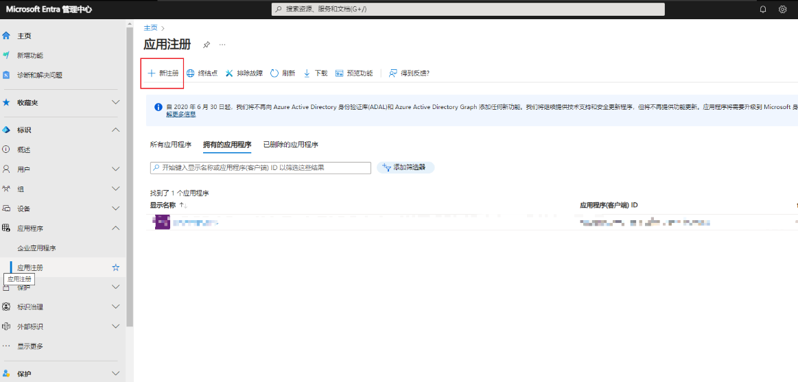 1、使用组织中管理员账号或拥有entra权限的账号登录到Microsoft Entra 管理中心(https://entra.microsoft.com),登录完成后,在[应用程序/应用注册]中点击<新注册>。
