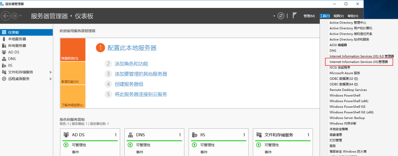 3、在Exchange邮件系统的服务器Winserver的服务器管理器·仪表板中点击<工具/IIS管理器>。