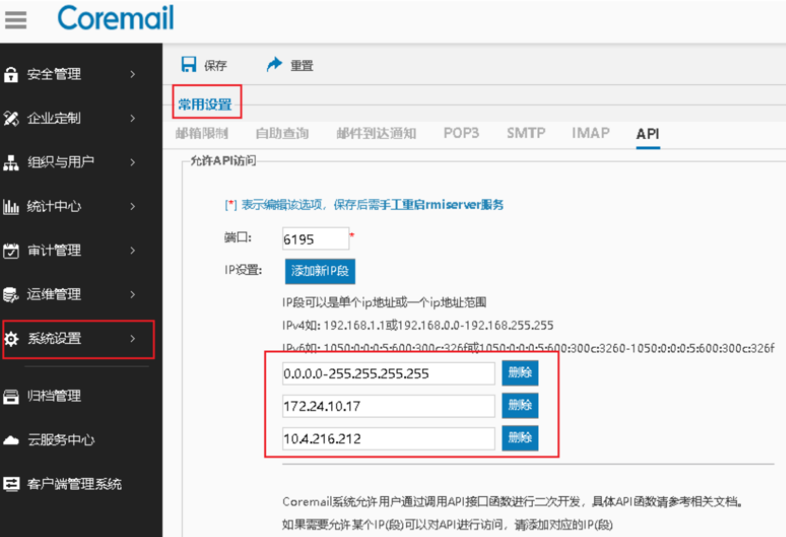 (2)API的访问会对源IP进行校验,需要在Coremail管理平台上进行放通配置,并重启rmiserver,0.0.0.0-255.255.255.255则是对所有IP放通(无需关注当前页面6195这个端口配置,实际上我们依赖的API端口是9900,也不需要在这里变动端口)