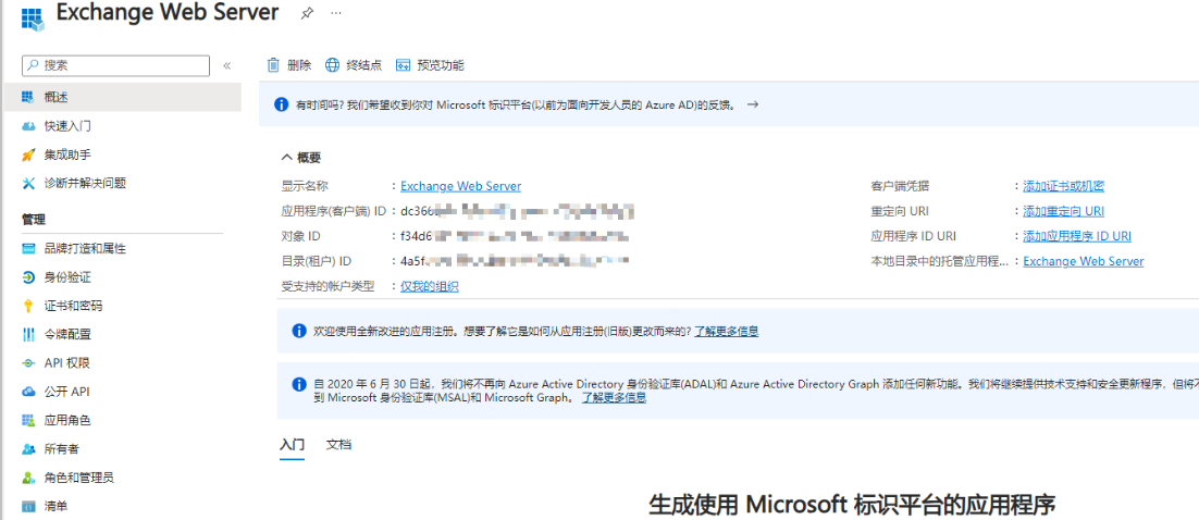 3、注册完成后即进入到应用概述中可以查看到基本信息。此处获取应用的应用程序(客户端)ID、目录(租户)ID。