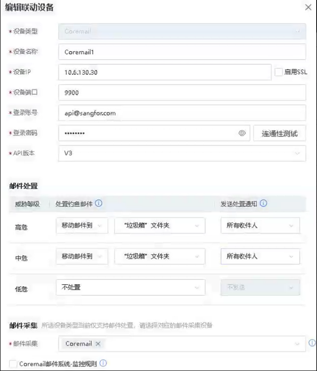 1、 登录防钓鱼大模型,打开[配置管理/设备接入]页面,设备类型选择“邮件处置:coremail”。设备名称可自定义,IP根据实际填入,端口默认为9900,以及coremail的账号和密码。邮件处置根据实际需求选择是否删除邮件、移动邮件到对应文件夹或不处置,以及是否要通知收件人等; 邮件采集处选择前面配置的BCC密送同域或跨域策略; Coremail邮件系统-监控规则处若coremail配置的监控收到的邮件与bcc密送配置的邮件采集策略一致则需要勾选,不一致则不勾选。
