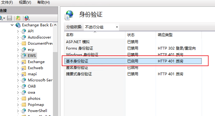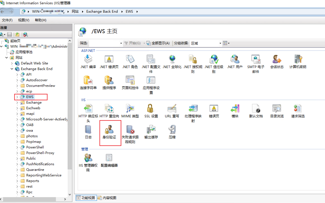 4、在[网站/Exchange Back End/EWS]中,选择<身份验证>。