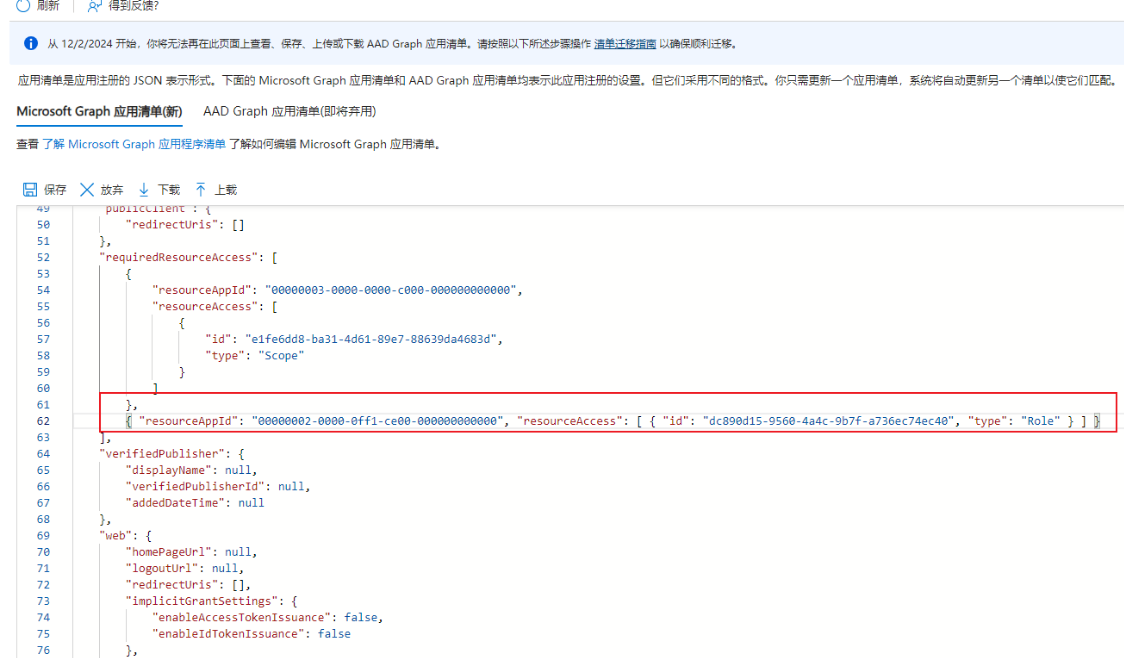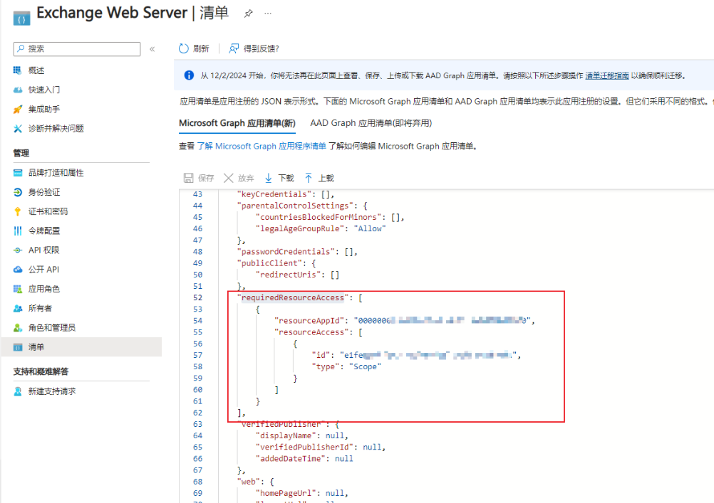 4、在应用中进入[清单]页面,找到requiredResourceAccess元素。