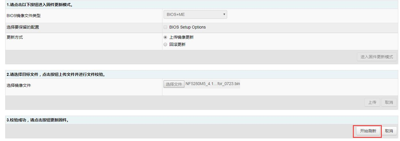 2.3、选择加载要升级的BIOS升级文件,升级文件选择完成后,再点击“上传”,上传成功后,点击开始刷新,升级过程注意查看下方升级进度条情况,升级完成后蓝色和绿色进度条加载完,显示注意:BIOS更新完需要重启生效,建议服务器AC断电