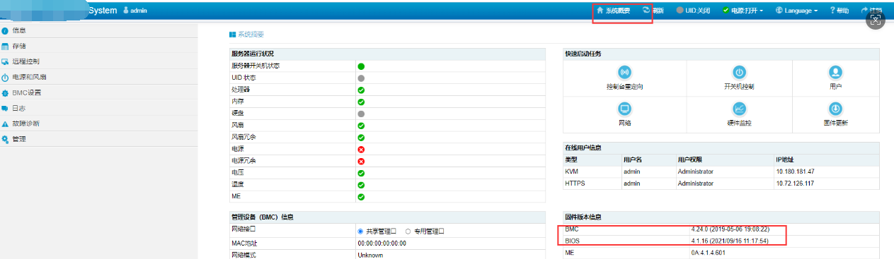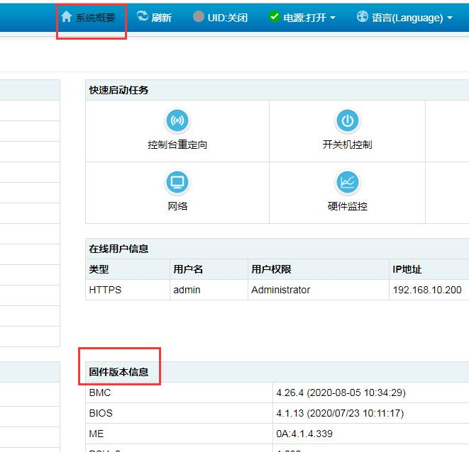 2.5、重新上电后登陆IPMI界面在系统概要—>固件版本信息查看,是否已升级对应的版本