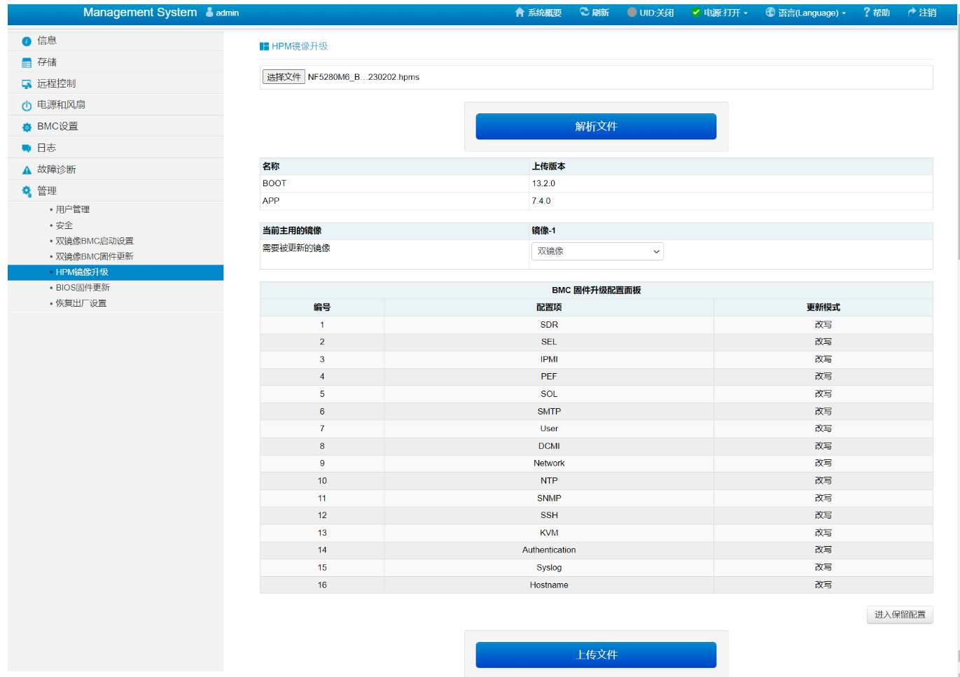 b、选择管理-HPM固件更新。选择要升级的固件(HPM格式),然后选择进入固件更新模式,建议保留network选项,否则更新bmc后,bmc地址将重置,bmc地址将会恢复成DHCP的模式。 保留完BMC信息后,请选择“上传文件”,然后bmc会进入更新模式。更新过程中不要中断,不要刷新界面!!更新完成后,bmc会重启,会断连1分钟左右。