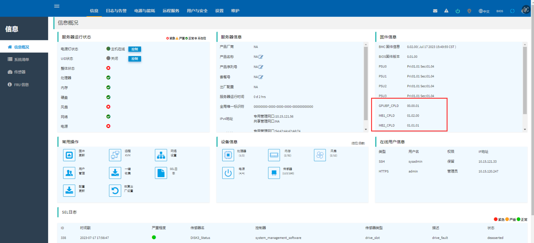 3.5、重启设备后在登录IPMI,在信息-> 信息概况-> 固件信息查看是否用升级上去