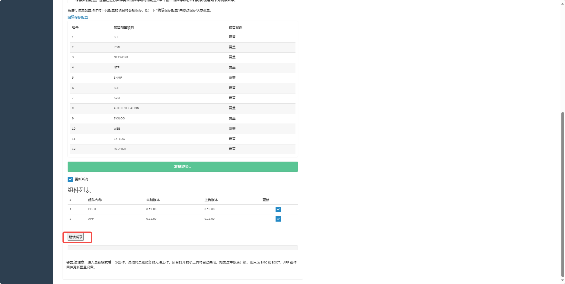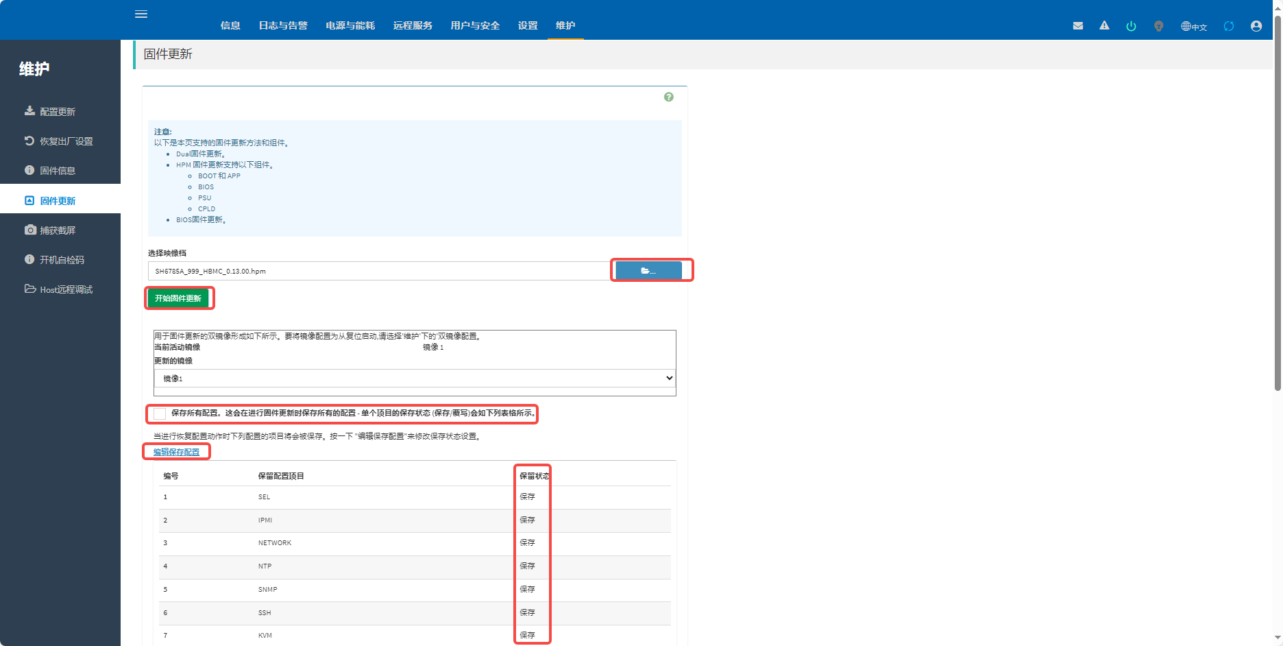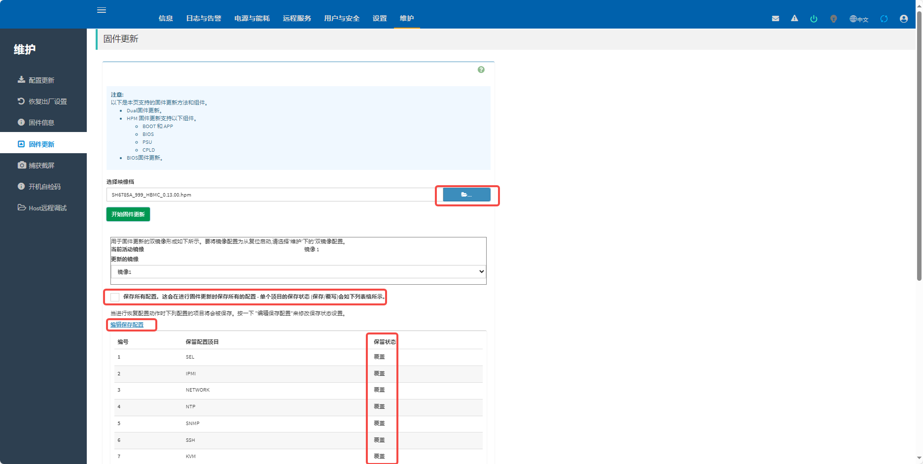 1.3、上传固件 -> 开始固件更新(如果IPMI无特殊配置建议不保留配置升级)