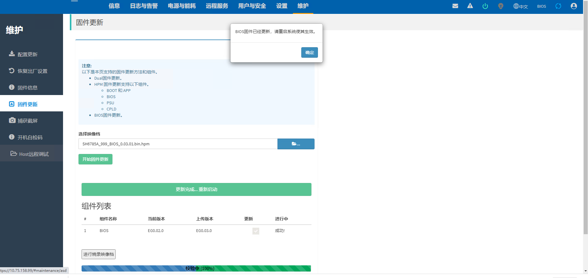 1.6、升级完后会自动重启BMC,重启完后在登录IPMI,在信息-> 信息概况-> 固件信息查看是否用升级上去