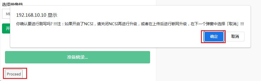 b、选择BIOSimage,点击“开始固件更新”,校验BIOSimage,校验BIOSimage完成提示界面点击“Proceed”,界面弹出如下确认烧录提示信息