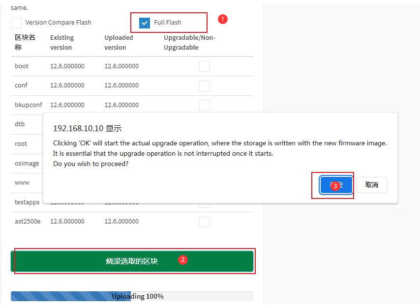 b、点击“启动固件更新”,等待镜像上传和校验,默认选中“FullFlash”,开始烧录