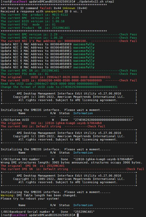 b、脚本执行完成后,请 reboot 重启系统去生效写入的 DMI 及 mac 地址,随后可以再次执行脚本检查,没有 Check Fail即为成功无异常