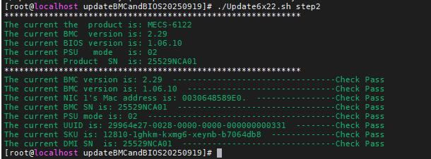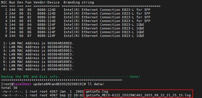 d、c步骤检测完有权限后在进/mecs-6122-upgrade路径执行./Update6x22.sh backup 备份升级前的信息,请确保 data/getinfo.log 的正常生成