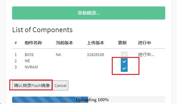 c、点击“确定”,开始等待uploadBIOSimage,upload完成出现如下“ListofComponents”界面(注意必须勾选同时更新 ME,Nvram 两个选项,等待升级成功后,系统