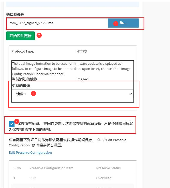 a、登录地址默认为 192.168.10.10,账号密码是sangfor/S#AN$6fo81,登录后进入 维护 -> 固件升级,选择要升级的 BMC 固件文件(rom_6122_signed_v2.29.ima)->更新镜像选镜像1->并建议勾选“保存所有配置”