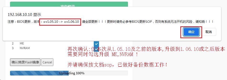 d、“ListofComponents”中包含三个组件,“BIOS”、“ME”与“NVRAM”,“BIOS”组件是强制选择的,剩于组件根据具体情况进行选择。点击“确认烧录Flash镜像”,弹出如下对特定BIOS版本烧录提示信息(注:如勾选MENVRAM后升级,需要重新写入刷DMI信息及网卡mac,备份方式见2.1)