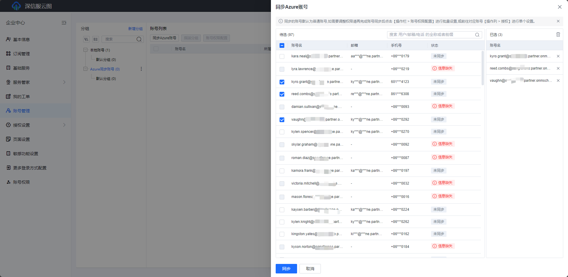 - 勾选需要同步的账号,然后点击同步按钮即可同步Azure账号,同步过的Azure账号可以通过步骤三登录云图。