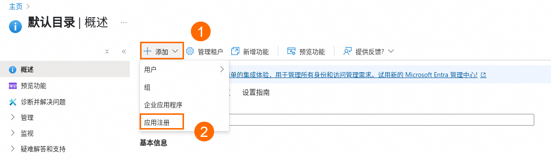 b、在弹出的概述页面,单击添加 > 应用注册。
