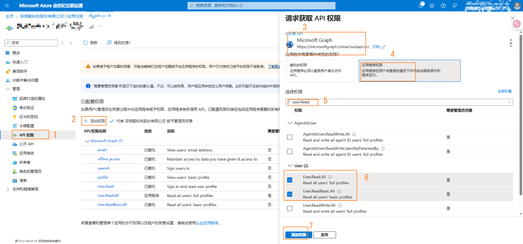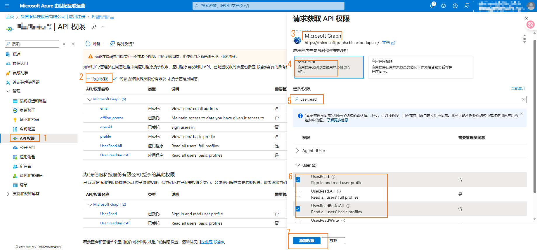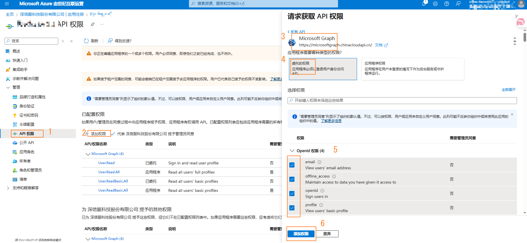 4. 配置委托权限OpenId、User.ReadBasic.All、User.Read