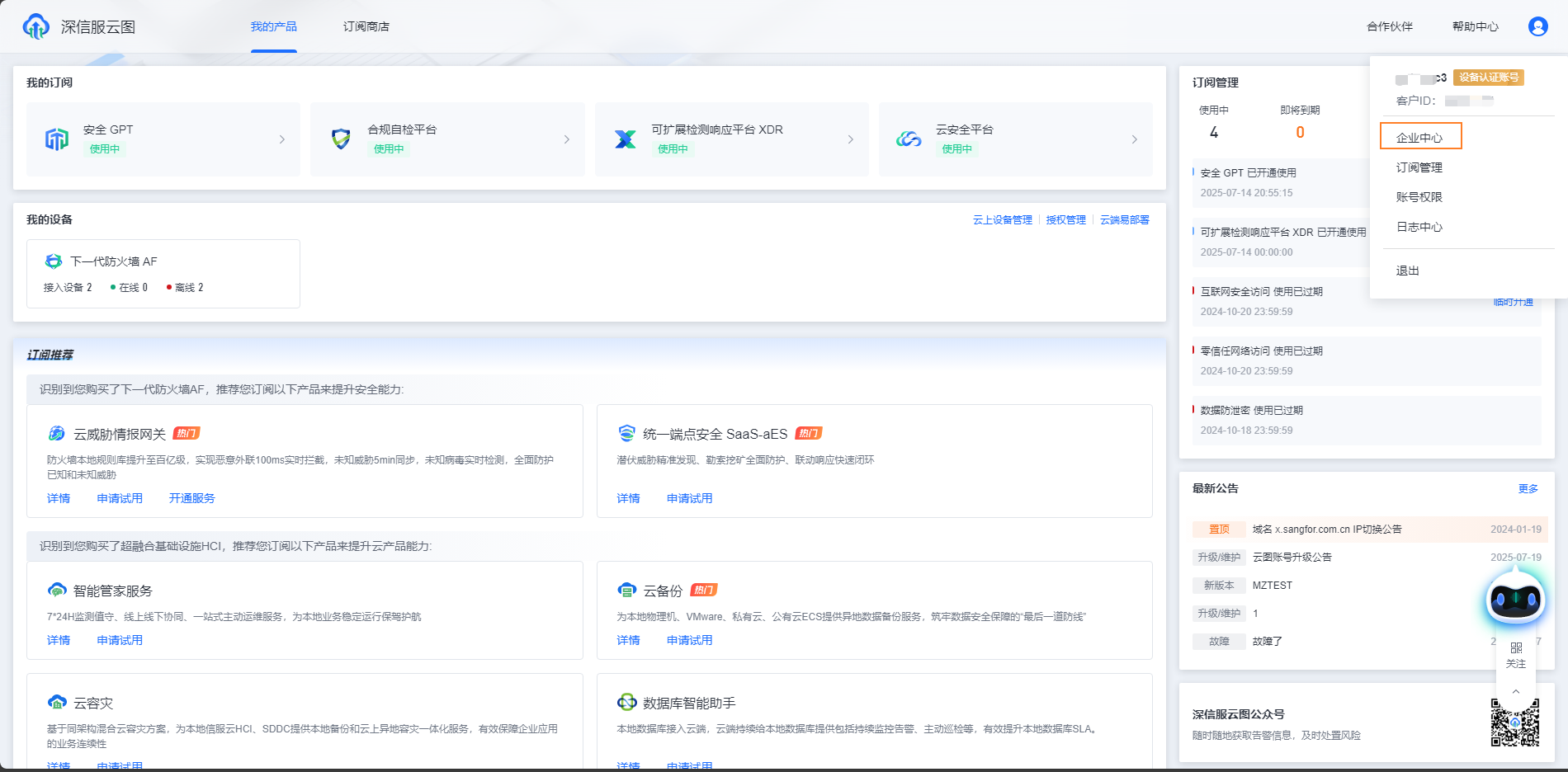- 使用主账号登录云图,点击头像弹窗中的企业中心按钮进入企业中心。