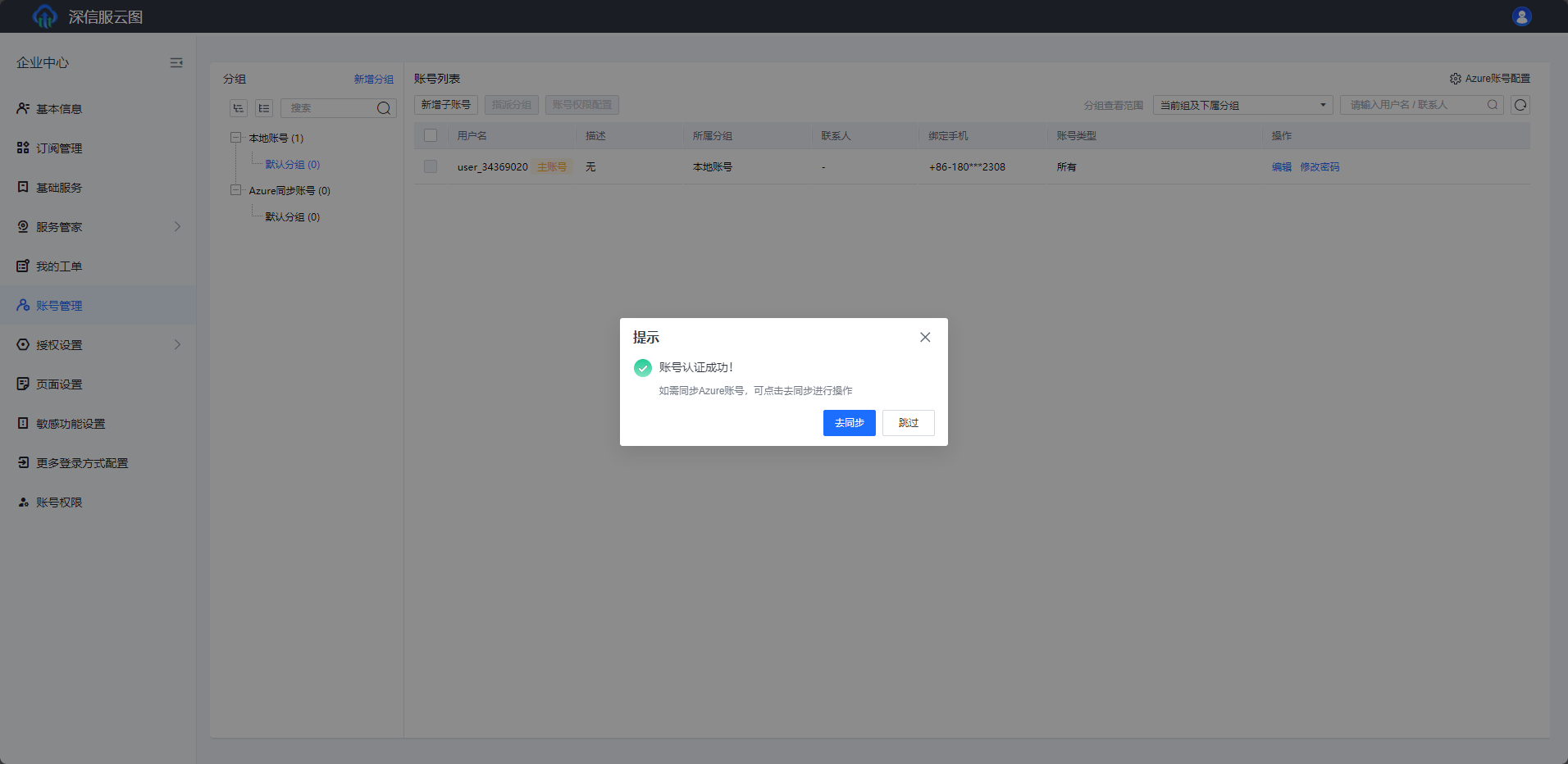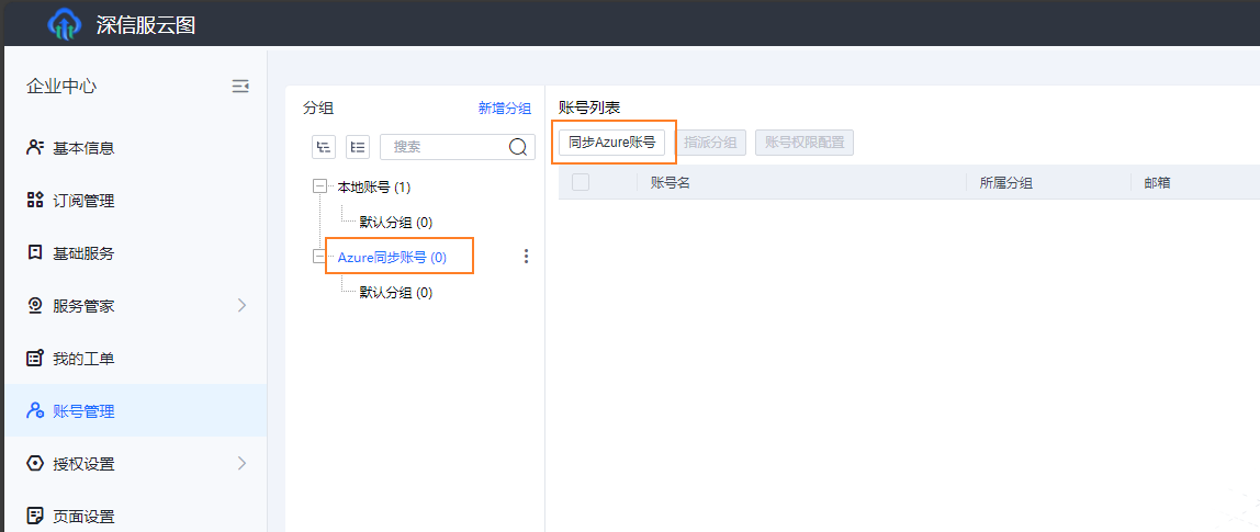 - 在Azure账号配置成功后点击蓝色去同步按钮或者进入Azure同步账号分组然后点击同步Azure账号按钮进入Azure账号同步页。