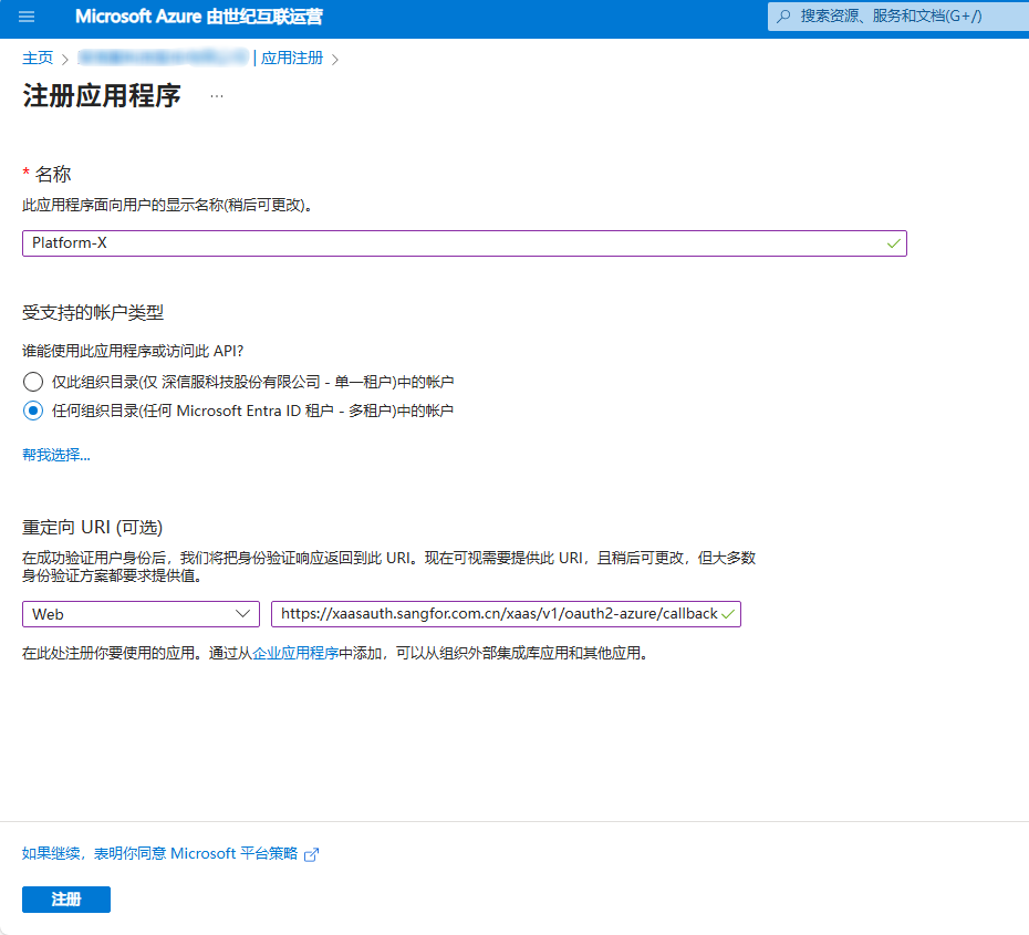 c、在注册应用程序页面输入名称,受支持的账户类型需选择任何组织目录,重定向URI选择Web。单击注册,即可创建一个新的应用程序。定义该应用名称为IDaaS。