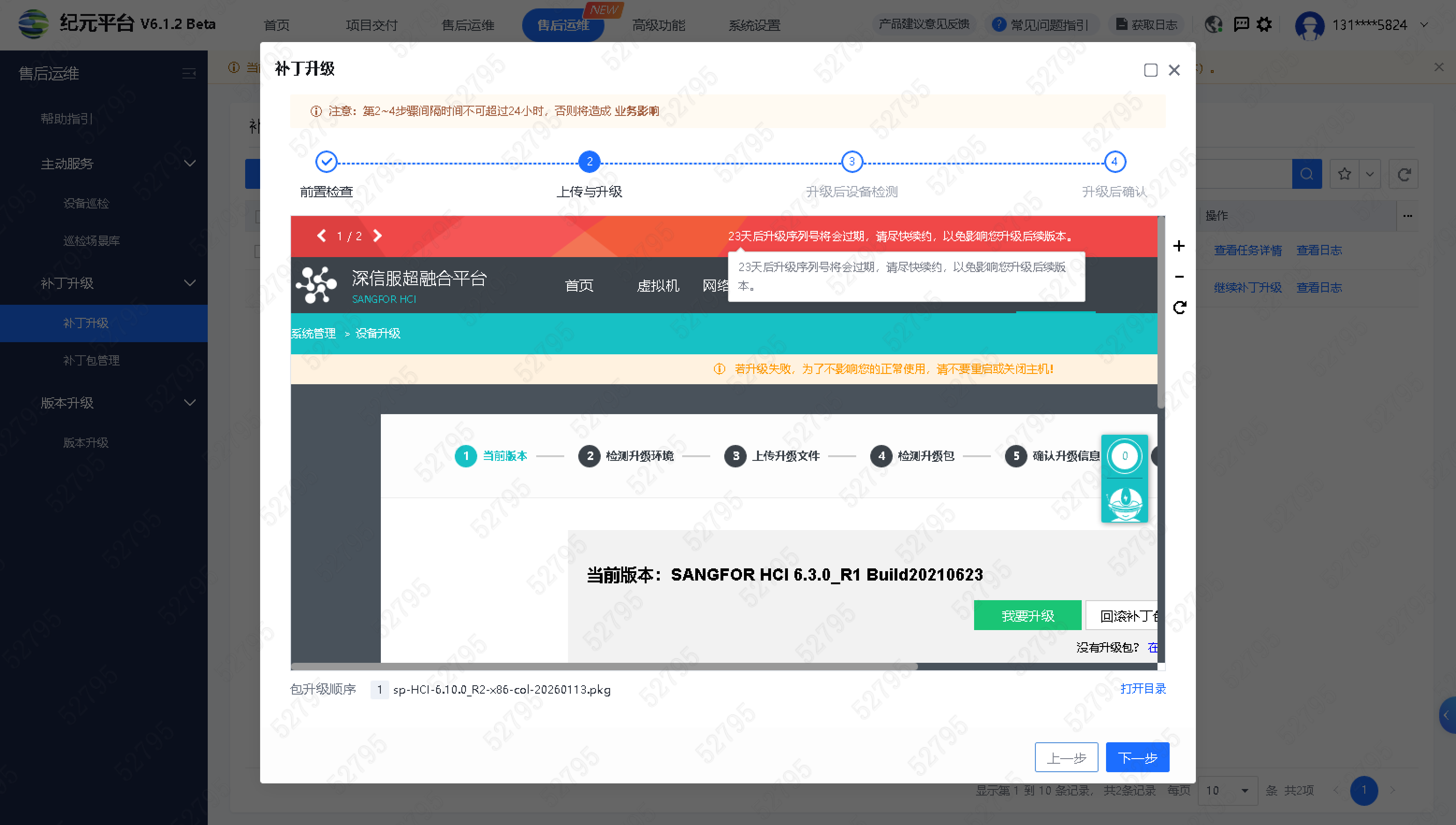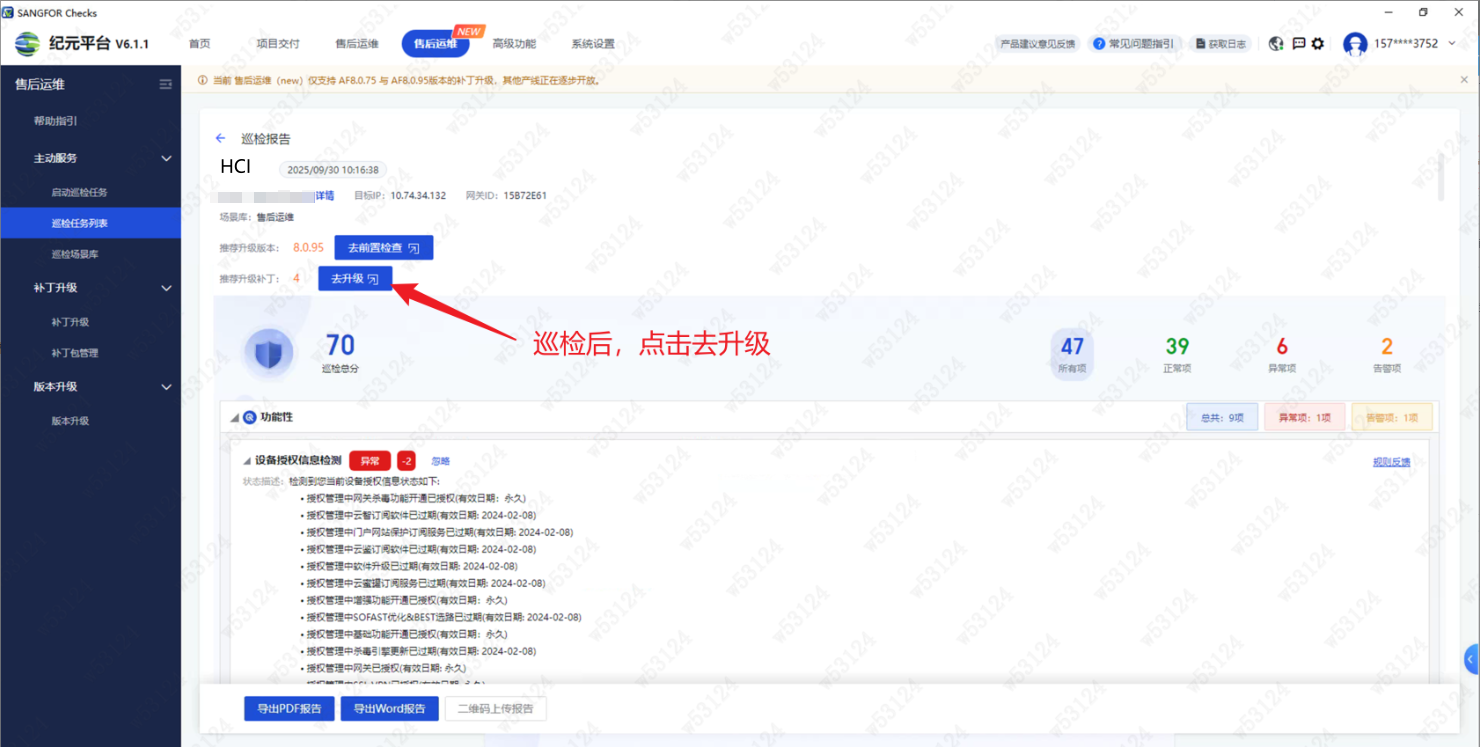 升级前请先进行售后运维巡检,巡检完成可自动生成版本维护报告,报告包含以下内容可协助您推动客户升级: