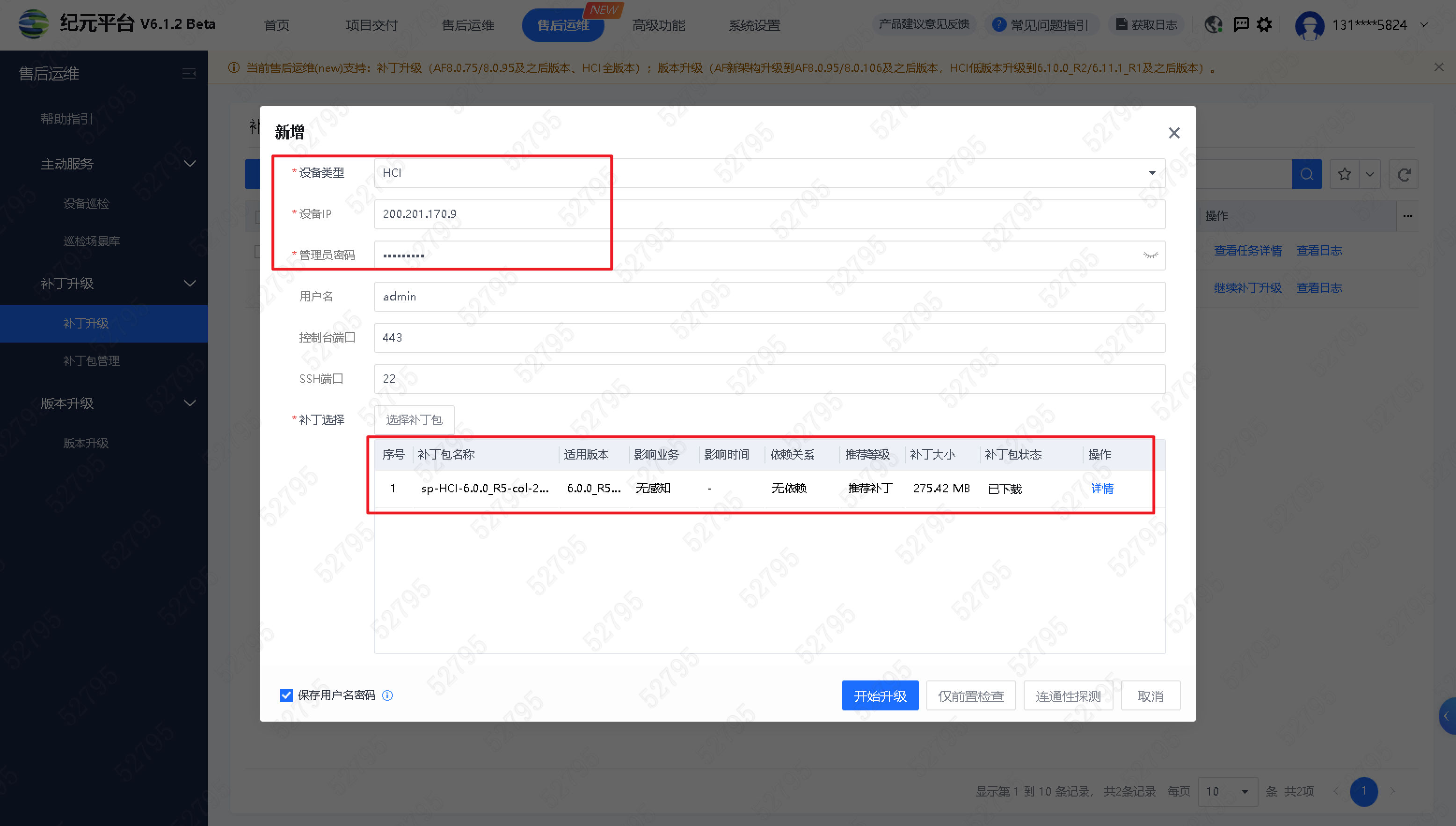 1. 若是通过巡检过来,会自动填充设备相关信息,也可以直接通过导航栏方式来到【补丁升级】界面