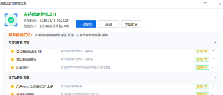 检查完成后,根据检查结果的形式,会提示那些需要一键修复,那些需要手动清